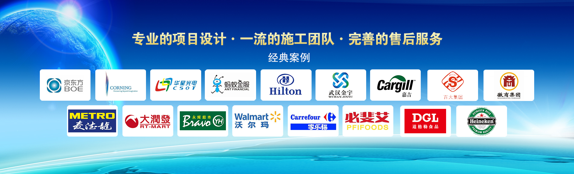 冷凍冷藏設備大型冷庫項目:   武漢中百物流冷庫(40000㎡)、蘇州、北京普洛斯大型物流庫(17000㎡)、沈陽佳德物流冷庫(20000㎡)、上海東航配餐物流庫(6000㎡)、杭州華商勾莊物流冷庫(24000㎡)、安徽安心蔬菜綠色食品冷庫(12000㎡)、武漢金宇冷庫(35000㎡)、必斐艾食品廠(14000㎡)、中國-東盟(百色)農產品交易中心冷庫物流工程(30000㎡)、遵鐵物流冷鏈物流區建設項目中心冷庫物流工程(16500㎡)、長沙云冷產業園冷庫物流工程(21000㎡)等;大型中央空調項目:   武漢康寧顯示玻璃廠廠房、武漢京東方模組廠房、武漢華星光電模組廠房、深圳華星光電模組廠房,杭州阿里巴巴辦公樓,舟山波音737機場辦公樓,南京江北能源站、上海金融大酒店等